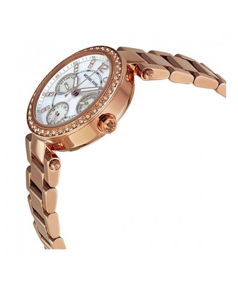 Orologio da donna multifunzione, in acciaio inossidabile con cinturino e cassa color oro rosa e quadrante in madreperla, impreziosito da cristalli.